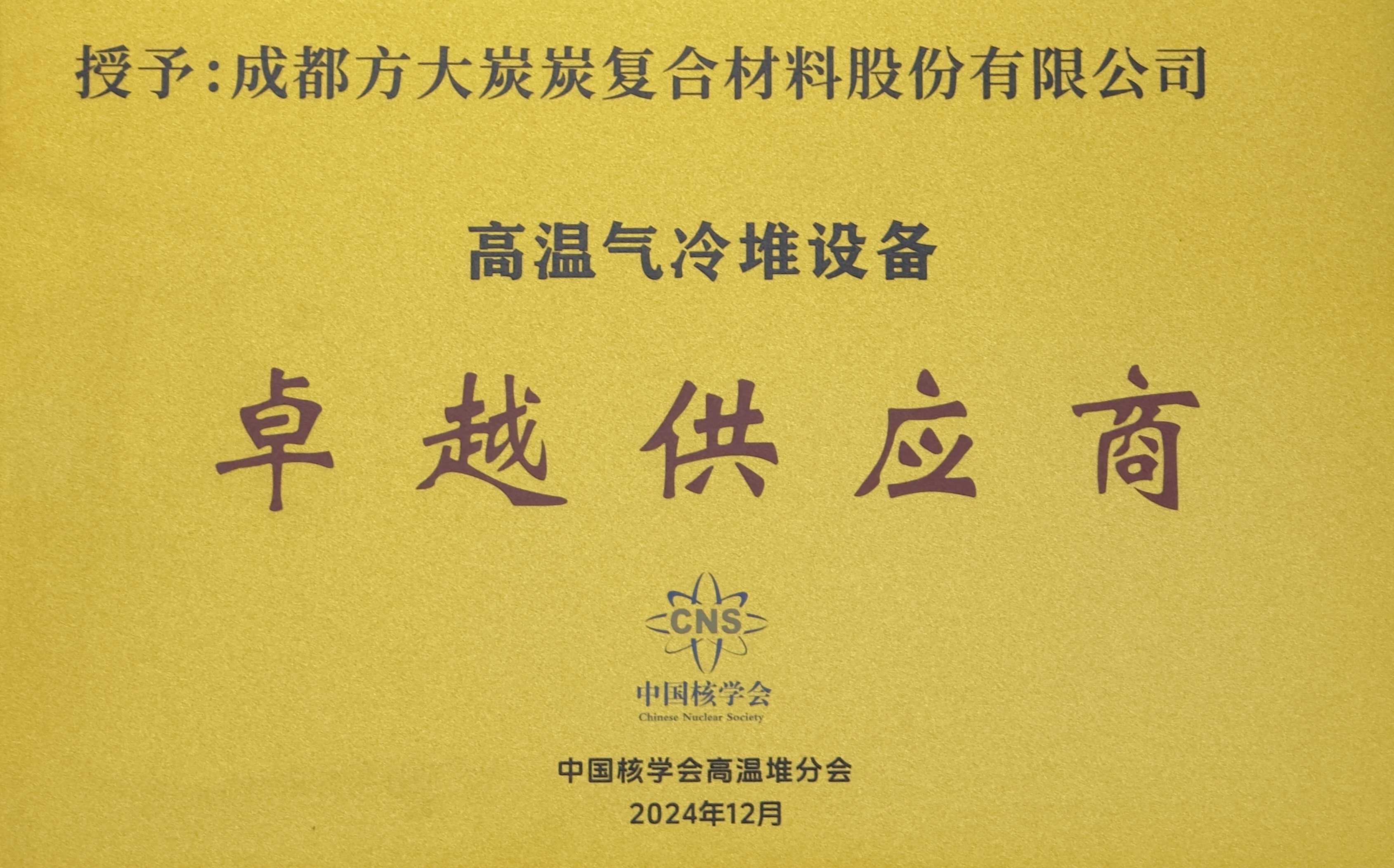 板塊動態(tài)|成都炭材收到中國核學會高溫堆分會“高溫氣冷堆設備卓越供應商”稱號及感謝信 方大炭素新材料 202...